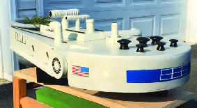 “Each birdhouse signifies a famous ship like the rocket for John Glenn or warships from the 1800's. All these ships are built from scratch using recycled wood with no plans; Warships from America like the USS Constellation , USCGC Eagle (AKA Horst Wessel), France's 1830's Napoleon Warship; British 1800's HMS Caledonia to my new fleet of Star Ships--Millennium Falcon, Rogue One , Tie Fighter and Star Fighter. The average size of these ships are from 30 inches to 38 inches long and they can be as high as 27 inches. These are birdhouses that I have not given away! One day I will need a new room just to display them or be thrown out of my house with my birdhouses. I guess I would rather be thrown out with the birdhouses.”